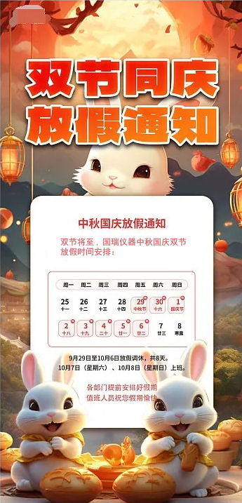 根據(jù)《國務(wù)院辦公廳發(fā)布關(guān)于 2023 年部分節(jié)假日安排的通知》,現(xiàn)將國瑞儀器2023年中秋國慶假日安排通知如下: