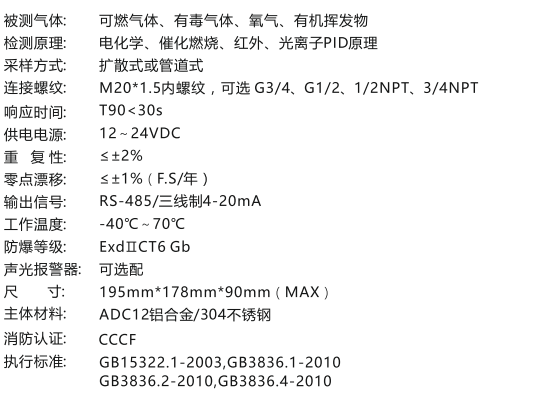 結(jié)構(gòu)模塊化、維護(hù)方便,接線安裝簡單國瑞智能傳感器平臺(tái),可即插即用,無需現(xiàn)場標(biāo)定快速響應(yīng)、測量精度高,運(yùn)行穩(wěn)定的檢測儀器通過防爆認(rèn)證、防護(hù)等級(jí)IP65、防腐蝕性高、抗電磁干擾豐富的傳感器量程選擇,可以滿足客戶的要求智能傳感器平臺(tái),可即插即用,離線標(biāo)定LCD實(shí)時(shí)顯示氣體濃度,有儀器狀態(tài),故障和通訊異常提示功能可設(shè)置高低報(bào)警點(diǎn),兩級(jí)聲光報(bào)警兩路繼電器可以控制外圍設(shè)備(如風(fēng)機(jī)和聲光報(bào)警器)動(dòng)作產(chǎn)品選擇材質(zhì)優(yōu)秀,具有良好的密封性,防腐性,防爆和抗磁干擾強(qiáng)儀表具用4-20MA輸出與RS-485輸出可以與GRI-8000系列和GRI-9800系列報(bào)警主機(jī)組網(wǎng)使用可以與GRI-9802單點(diǎn)報(bào)警主機(jī)組網(wǎng),每點(diǎn)匹配,點(diǎn)點(diǎn)組合。